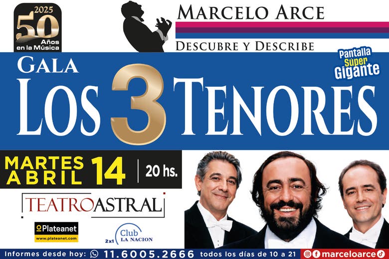 Accede al beneficio para MARCELO ARCE - GALA LOS 3 TENORES ingresando tu número de credencial de Club LA NACION en la web del Plateanet. Única función el martes 14 de abril a las 20 hs en el Teatro Astral.